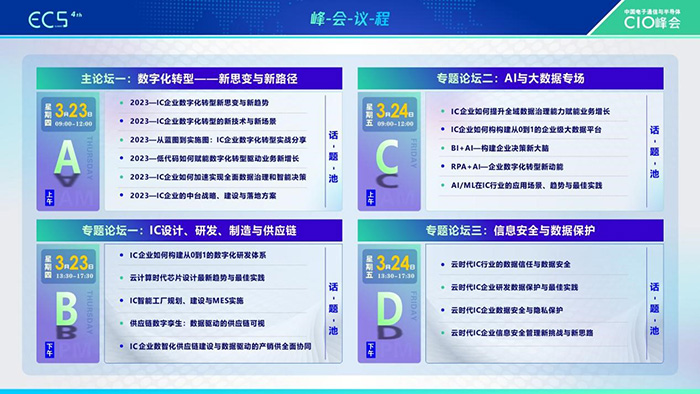 ECS 2023第四屆中國(guó)電子通信與半導(dǎo)體CIO峰會(huì)同期將舉行精品展臺(tái)、CIO面對(duì)面、硬核座談會(huì)、“ECS2023”歡迎晚宴等活動(dòng)。