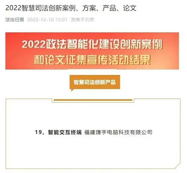 近日,由中央政法委機(jī)關(guān)報(bào)《法治日?qǐng)?bào)》主辦的“2022政法智能化建設(shè)創(chuàng)新案例”結(jié)果公布,其中捷宇科技的“智能交互終端”入選智慧司法創(chuàng)新產(chǎn)品!