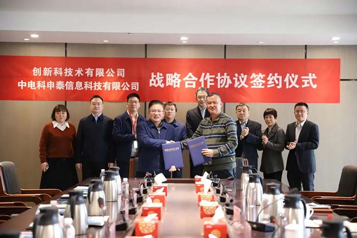 電科申泰董事長肖志強(qiáng),副總經(jīng)理周昱、韓磊及相關(guān)部門負(fù)責(zé)人,創(chuàng)新科董事長陳凱,聯(lián)席董事長蔡文沁,高級副總裁馬玉英、副總裁楊學(xué)敏等出席了簽約儀式。