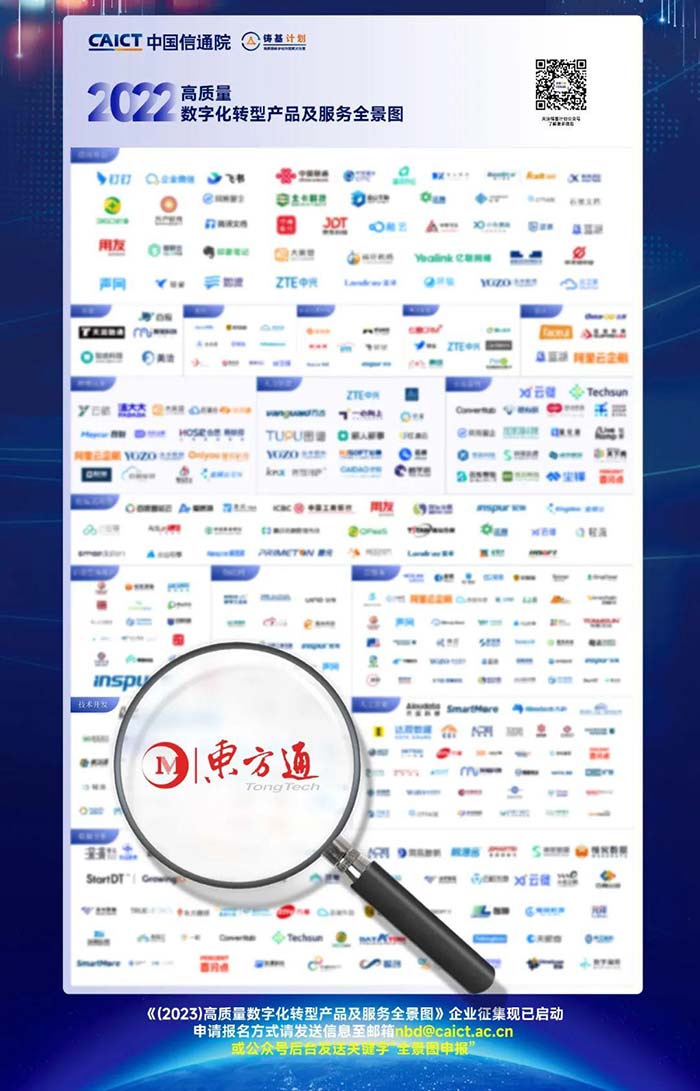 當(dāng)前,東方通已連續(xù)十二年被認定為“國家規(guī)劃布局內(nèi)重點軟件企業(yè)”,承擔(dān)多項國家重大科技專項的研制任務(wù),曾榮獲國家科技進步二等獎、 北京市科學(xué)技術(shù)進步獎二等獎等多項榮譽。此次入選中國信通院的《高質(zhì)量數(shù)字化轉(zhuǎn)型產(chǎn)品及服務(wù)全景圖(2022)》,也讓東方通更加堅信,未來的使命不只是要專注眼前的技術(shù)與業(yè)務(wù)創(chuàng)新,更要面向客戶、行業(yè)與社會,提供跨越時間周期的長遠價值。