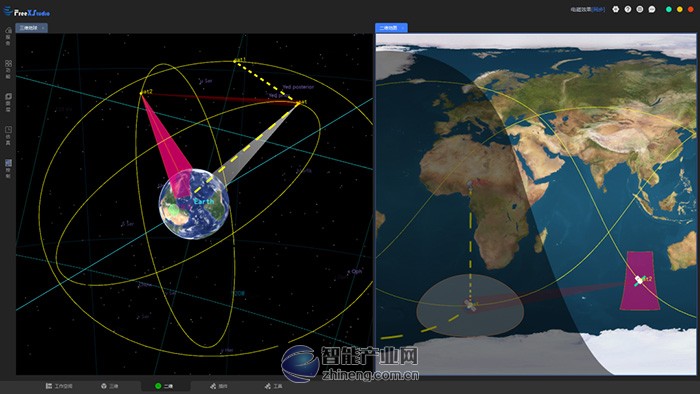 天地一體可視化平臺(tái)(FreeXGIS AeroSpace)基于FreeXGIS開(kāi)發(fā),構(gòu)建了完整的空天地一體化仿真環(huán)境,能夠針對(duì)衛(wèi)星發(fā)射、在軌運(yùn)行、任務(wù)執(zhí)行、數(shù)據(jù)鏈路傳輸、復(fù)雜太空電磁環(huán)境等相關(guān)的動(dòng)態(tài)過(guò)程以及深空探測(cè)(登陸月球、火星探測(cè))等科學(xué)活動(dòng)進(jìn)行仿真模擬。