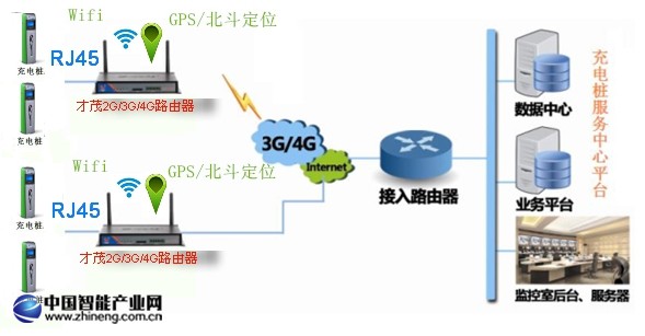 充電樁無線數(shù)據(jù)應(yīng)用拓?fù)鋱D(才茂2G/3G/4G路由器+wifi+GPS定位)