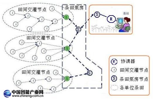 網(wǎng)絡(luò)采用二級網(wǎng)絡(luò)方式。中心(協(xié)調(diào)器)和泵房控制器之間的網(wǎng)絡(luò)是一級網(wǎng)絡(luò),也稱泵房網(wǎng)絡(luò)。中心為一級網(wǎng)絡(luò)的中心。泵房控制器(市電供電的無線模塊節(jié)點(diǎn))和泵房所管的條田里的控制器(電池供電節(jié)點(diǎn))之間的網(wǎng)絡(luò)是二級網(wǎng)絡(luò)。也稱條田網(wǎng)絡(luò)。