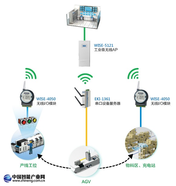 研華的無線解決方案分成三大部份來滿足此項目之需求。首先,以工業(yè)等級的無線APWISE-5121來搭建足以涵蓋整座廠房的Wi-Fi網(wǎng)絡(luò);其次,于工位與AGV充電站均安裝基于以太網(wǎng)絡(luò)的無線I/O模塊WISE-4050,藉此即能采集與傳送工位缺料信息與AGV充電信息;第三部分則是為AGV配置串口設(shè)備服務(wù)器EKI-1361以便連接車上的PLC控制器并上傳數(shù)據(jù)至系統(tǒng),同時,依托精簡型觸控計算機(jī)TPC-1251T負(fù)責(zé)管理AGV的運行數(shù)據(jù)。