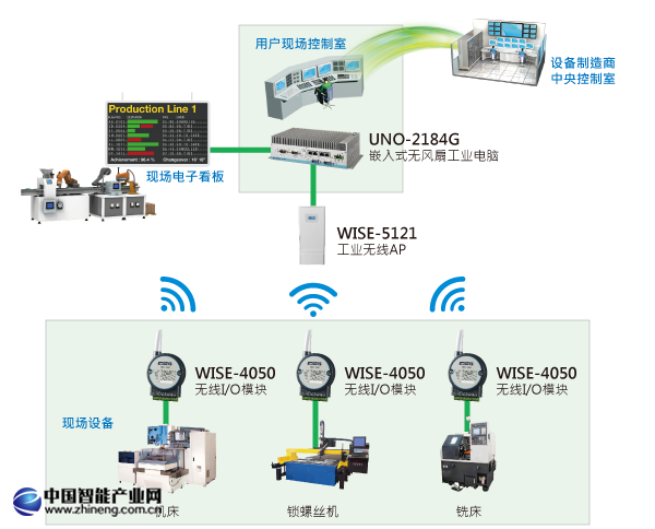 研華以物聯(lián)網(wǎng)無線數(shù)據(jù)采集模塊WISE-4050與無線基地臺(tái)(AP)WISE-5121搭配嵌入式工業(yè)計(jì)算機(jī)UNO-2184G所組成的無線數(shù)據(jù)采集解決方案能大幅縮減導(dǎo)入設(shè)備監(jiān)控管理系統(tǒng)時(shí)所需的建置成本與安裝時(shí)間。其中,貼附在機(jī)器設(shè)備旁的WISE-4050是負(fù)責(zé)收集設(shè)備啟停、故障、運(yùn)行時(shí)間、產(chǎn)量計(jì)數(shù)等信息;而所有數(shù)據(jù)則會(huì)經(jīng)由WISE-5121無線AP匯集至客戶工廠內(nèi)的UNO-2184G進(jìn)行初步運(yùn)算處理,之后再傳送至設(shè)備制造商的控制中心供其遠(yuǎn)程監(jiān)控,并且為客戶量身打造設(shè)備維護(hù)與預(yù)防保養(yǎng)計(jì)劃。而工廠方面則能運(yùn)用收集來的設(shè)備信息,以電子廣告牌實(shí)時(shí)顯示機(jī)臺(tái)的生產(chǎn)狀態(tài),也能將資料匯入企業(yè)的MES/ERP以協(xié)助生產(chǎn)排程與物料需求之規(guī)劃。