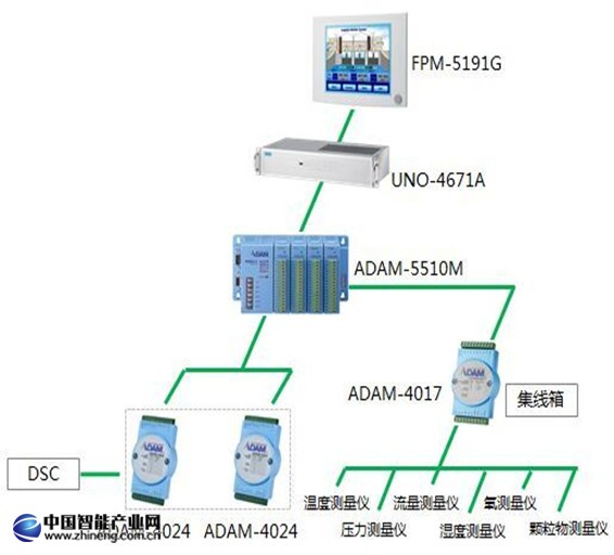 8路AI模塊 ADAM-4017+內(nèi)置于集線箱,實(shí)現(xiàn)現(xiàn)場端數(shù)采集,煙氣煙塵濃度、煙氣參數(shù)(溫度、壓力、流量、濕度、含氧量)在煙道上直接采集;ADAM-4017可解決早期案中,由于本地 4-20MA在煙道上輸出,離控制室較遠(yuǎn),需要將大量信號線直接連到PAC或工控機(jī)的問題,并節(jié)約大量布線成本,更加便于維護(hù)。