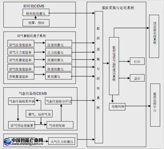 系統(tǒng)包括顆粒物測量子系統(tǒng)(煙塵濃度)、氣態(tài)污染物濃度測量子系統(tǒng)(SO2、NOX)、煙氣參數(shù)測量子系統(tǒng)(測量煙氣溫度、煙氣壓力、流、煙氣含氧量、煙氣含濕量和數(shù)據(jù)采集處理及通訊子系統(tǒng)(顯示和打印各種參數(shù)、圖表并通過數(shù)據(jù)圖文傳輸系統(tǒng)傳輸至管理部門)四部分,除了對上述的環(huán)保監(jiān)測外,同時(shí)對電力及冶金、水泥行業(yè)工藝過程監(jiān)測。
