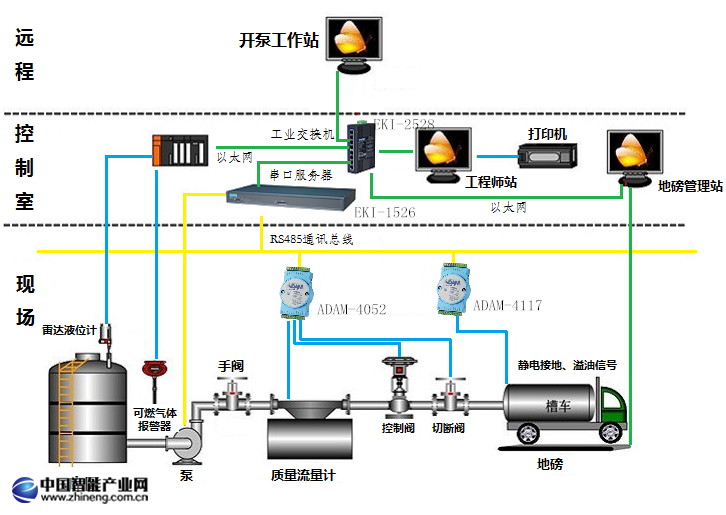 BCS(batch cotrol system)系統(tǒng)包括現(xiàn)場計量采集控制部分,操作站部分,及監(jiān)控中心部分?,F(xiàn)場采集控制主要完成罐車液位測量,質(zhì)量流量計傳輸,泵閥控制,靜電報警,溢油報警等。操作站通過RS485通訊網(wǎng)絡(luò)完成數(shù)據(jù)采集控制信息匯總,通過工業(yè)以太網(wǎng)與上位機相連接,并連接打印機實時打印報表。遠程監(jiān)控中心主要完成遠程數(shù)據(jù)實時監(jiān)控。