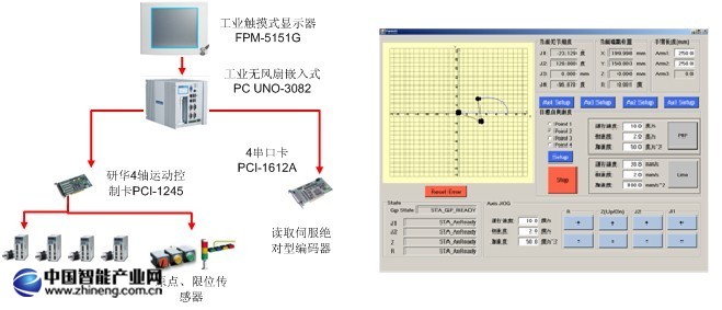 搭配研華基于DSP的4 軸運(yùn)動(dòng)控制卡及工業(yè)多串口卡用于四SCARA機(jī)械手控制。
