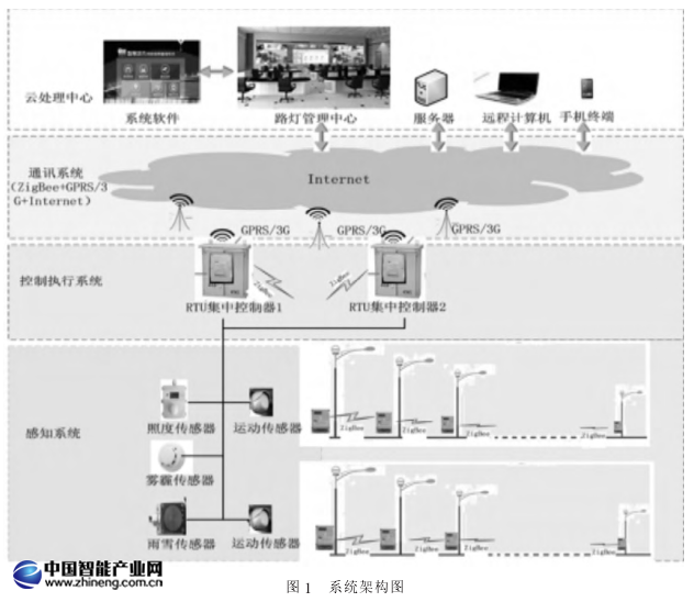 智慧照明分為四層架構(gòu):云處理中心,通訊層,感知層,控制執(zhí)行層。圖1為系統(tǒng)架構(gòu)圖。
