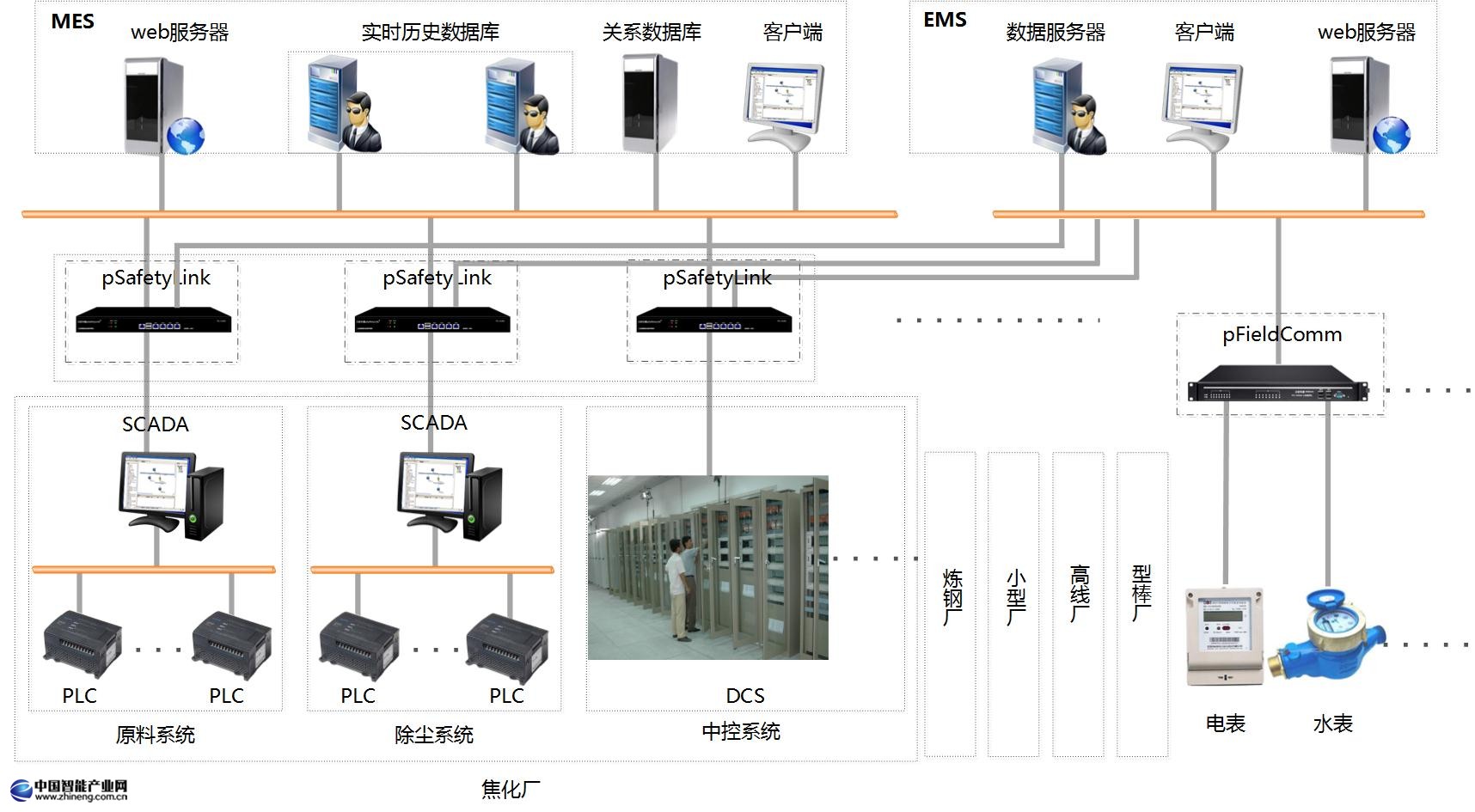 鋼鐵冶金企業(yè)MES和能源管控中心的建設(shè)是快速降低產(chǎn)品單耗,減少排放的有效手段,也是企業(yè)由數(shù)量型向質(zhì)量效益型轉(zhuǎn)變的重要舉措。鋼鐵冶金企業(yè)具有生產(chǎn)流程長(zhǎng)、生產(chǎn)裝置分布點(diǎn)多、面廣的特點(diǎn)。其控制系統(tǒng)的種類(lèi)、廠家眾多且紛繁復(fù)雜,網(wǎng)絡(luò)架構(gòu)層次較多,給MES、EMS系統(tǒng)的信息安全建設(shè)帶來(lái)很大的挑戰(zhàn)。