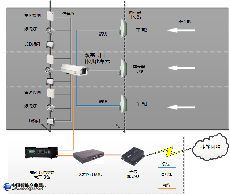 外場雙基基站建設(shè):除了收費(fèi)區(qū)域、收費(fèi)標(biāo)準(zhǔn)外,還有要圍繞收費(fèi)區(qū)域的各出入口建設(shè)識別基站,原則上每條道路的出入口都需要建設(shè),建議采用大華雙基識別基站,既采集車輛過車照片,也采集電子車牌讀卡信息,并且建立兩者之間的關(guān)聯(lián)。以單向三車道為例,采用大華700萬卡口雙基一體化抓拍單元,路口設(shè)備布置圖如圖所示。