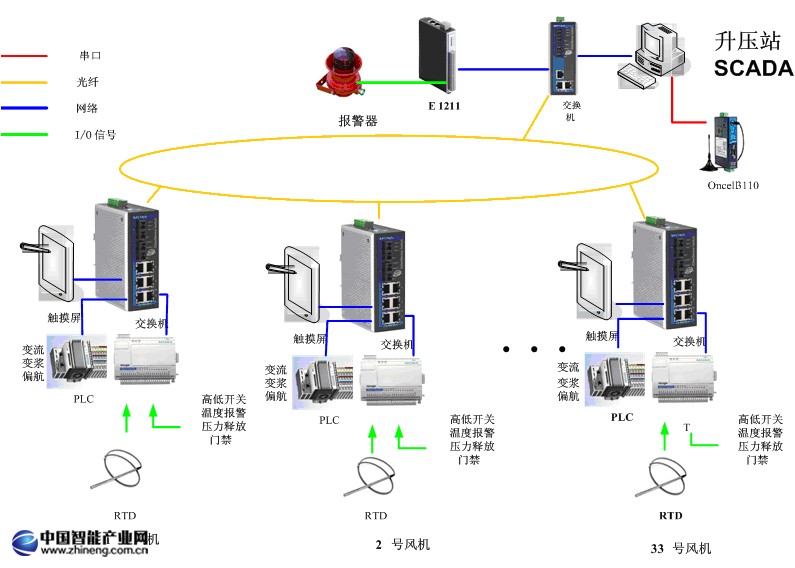 在這個案例中,一個風(fēng)場共有33臺1.5MW的風(fēng)機(jī),每臺風(fēng)機(jī)搭配一臺箱變,因此在每臺箱變中選用一臺ioLogik E2242(或E1261),來采集箱變中的油溫、壓力、報警開關(guān)、瓦斯保護(hù)等參數(shù)數(shù)據(jù)。ioLogik E2242(或E1261)向上連接現(xiàn)場交換機(jī),所有的交換機(jī)組成光纖環(huán)網(wǎng),以確保數(shù)據(jù)可以實時的上傳至SCADA系統(tǒng)?;谶@種架構(gòu),客戶只需極少的投入就實現(xiàn)了風(fēng)機(jī)箱變的在線監(jiān)測功能,一旦發(fā)生問題,系統(tǒng)會自動報警,大大減少了人員的出差和后期設(shè)備維護(hù)成本。