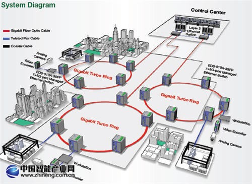 膠州電能集團擁有位于3個不同城市的30個變電站。 為了更可靠地進行配電監(jiān)控,膠州電能集團為他們的能量控制系統(tǒng)部署了一個以太網(wǎng)環(huán)形拓撲結構。 基于這30個變電站所處的位置,使用 Moxa 公司的 EDS-510A-3SFP Gigabit 網(wǎng)管型以太網(wǎng)交換機建造了3個環(huán)形以太網(wǎng)。 這些環(huán)形以太網(wǎng)使用 Moxa 公司的 Turbo Ring 專利技術作為備用系統(tǒng)。 配電系統(tǒng)的保護繼電器直接連接到 EDS-510A-3SFP 交換機上,共同組成一個受 Moxa 公司 Turbo Ring 協(xié)議保護的環(huán)形拓撲,從而保證在網(wǎng)絡故障時實現(xiàn)毫秒級的恢復。 此外,每一個 EDS-510A-3SFP 交換機都連到一個用于視頻監(jiān)控的工作站,從而為系統(tǒng)維護人員在現(xiàn)場進行監(jiān)測操作提供了一個有效的途徑。 EDS-510A 交換機配備有三個 Gigabit 以太網(wǎng)端口以提供高帶寬的解決方案,不僅為冗余 Gigabit Turbo Ring 骨干提供能量,也留下一個空的 Gigabit 端口用于向上連接到核心交換機上。