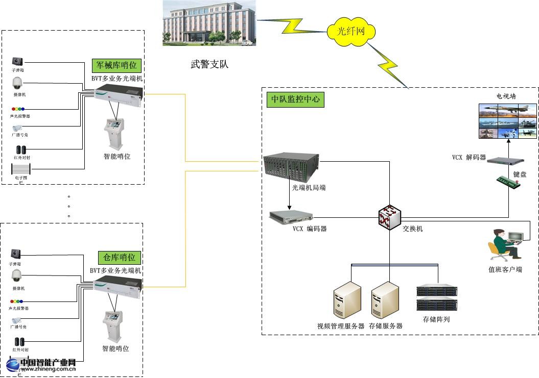 針對(duì)武警信息化建設(shè),蛙視推出了BVT多業(yè)務(wù)光傳輸系統(tǒng),實(shí)現(xiàn)光纖到智能哨位的多業(yè)務(wù)傳輸。武警部隊(duì)管轄地區(qū)的前端設(shè)備:網(wǎng)絡(luò)攝像機(jī)、模擬攝像機(jī)、電子圍欄、廣播好覺、語音對(duì)講、紅外對(duì)射、子彈箱等,通過BVT多業(yè)務(wù)光端機(jī),將前段數(shù)據(jù)通過光纖傳到武警中隊(duì)監(jiān)控中心。