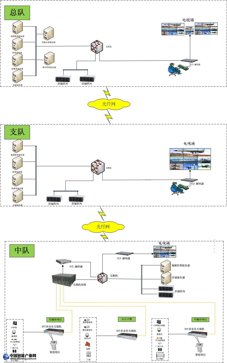 武警中隊(duì)監(jiān)控點(diǎn)視頻、數(shù)據(jù)和報(bào)警燈信號(hào)采用BVT多業(yè)務(wù)光端機(jī)通過光纖傳輸至本地監(jiān)控值班室,本地監(jiān)控管理人員可對(duì)監(jiān)控區(qū)域內(nèi)視頻、數(shù)據(jù)進(jìn)行調(diào)看和管理;各武警中隊(duì)監(jiān)控點(diǎn)的視頻、數(shù)據(jù)和報(bào)警等信號(hào),采用光纖或者以太網(wǎng)的方式,傳輸?shù)街ш?duì)監(jiān)控中心;支隊(duì)監(jiān)控中心通過光纖網(wǎng)絡(luò)構(gòu)建與總隊(duì)的傳輸系統(tǒng)。