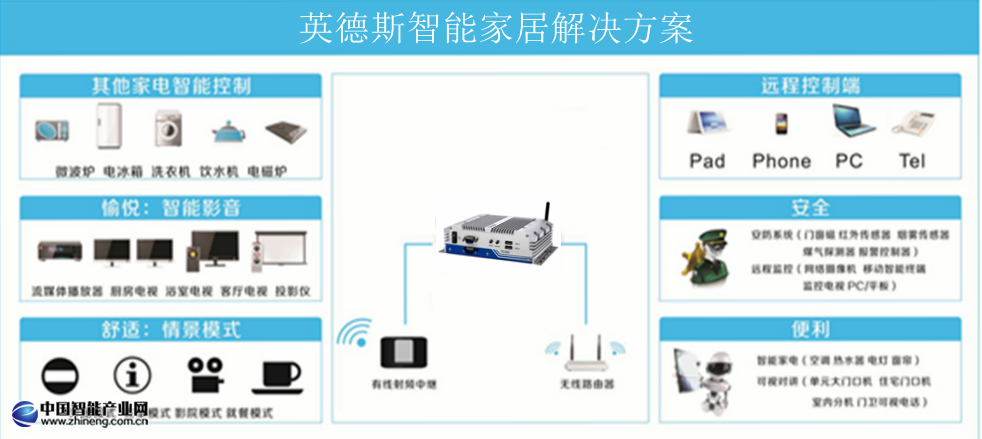 隨著計(jì)算機(jī)技術(shù)、網(wǎng)絡(luò)和信息技術(shù)的不斷發(fā)展,以及人們對(duì)生活要求的不斷提高,享受智能化的家居生活已經(jīng)成為可能,并且成為必然的趨勢(shì)。數(shù)字式環(huán)境、網(wǎng)絡(luò)信息化家電、智能型住宅成為人們追求的生活空間。數(shù)字住宅的智能化需要自動(dòng)化解決方案的支持,需要一部可提供多種連接接口的嵌入式無(wú)風(fēng)扇工控機(jī)為平臺(tái),連接到住宅的監(jiān)視系統(tǒng)、門禁系統(tǒng)、燈光控制、音視頻控制、安防控制、室內(nèi)溫度控制等子系統(tǒng)或其他系統(tǒng)??刂浦鳈C(jī)能夠采集信息,進(jìn)行處理、儲(chǔ)存和輸出,輕松實(shí)現(xiàn)室內(nèi)照明控制、窗簾控制、溫度控制、家電控制、門鎖監(jiān)控、家庭影院、背景音樂(lè)播放等時(shí)尚科技風(fēng)的現(xiàn)代家居,體驗(yàn)高效、舒適、安全、便利、節(jié)能的生活環(huán)境。下面詳細(xì)介紹華英德斯用英特爾® 凌動(dòng)™ 平臺(tái)打造的智能家居系統(tǒng)方案。