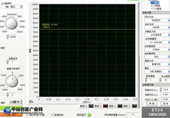 這一部分是EM9636BD數(shù)據(jù)采集卡的應(yīng)用,在這一部分中,最重要的是采集參數(shù),其中包括物理信道的選擇,采樣方式,采樣率,采樣通道數(shù),分辨率,時鐘源等設(shè)置。數(shù)據(jù)保存是把采集來的數(shù)據(jù)保存到DAT文件里,可以通過LabVIEW編寫的程序回放,數(shù)據(jù)采集程序如圖4.2所示、數(shù)據(jù)回放界面如圖4.3所示。