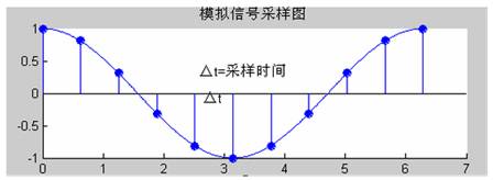 如果此刻對一個模擬信號x(t)每隔△t間隔采樣一次。時間間隔△t被叫做采樣間隔或者采樣周期。它的倒數(shù)l/△t被稱為采樣頻率,單位是采樣數(shù)/每秒。 t=0,△t,2△t,3△t...等等,x(t)的數(shù)值就被稱為采樣值。所有的x(0),X(△T),X(2 T)的采樣值。所以數(shù)據(jù)信息所表示的離散的點可以用一組分散的采樣值來表示:{x(0),x(△t),x(2△t),x(3△t),...x(k△t),„}單個模擬信號和它采樣后的采樣值如圖3.2所示。采樣間隔是△t,注意,采樣所得到的點在時域圖上表示的是離散的。
