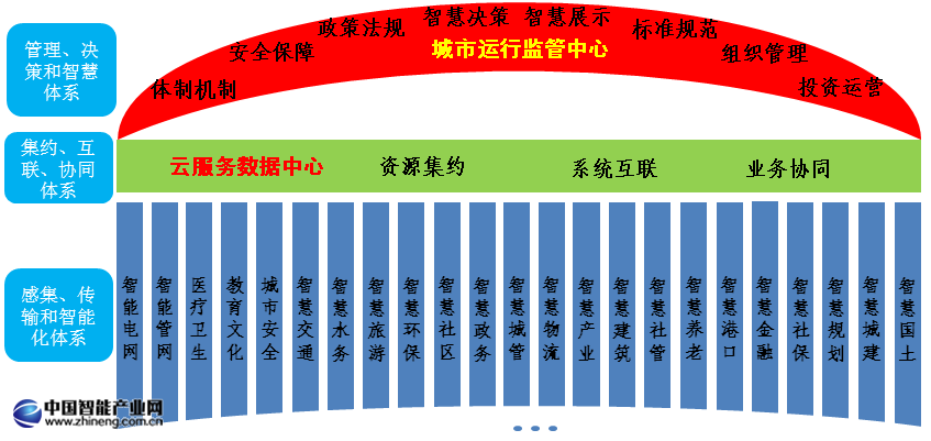 ‘感集’:是信息技術的感知與采集,它讓我們的城市可以看得見、感受到城市發(fā)展方方面面的信息。 ‘傳輸’:是信息的傳遞,它將我們‘感集’所獲取到的信息傳遞到智能化后端進行存儲和處理。 ‘智能化’:是將‘感集’所獲取到的信息根據需求進行存儲和處理,并輸出相應的結果,是城市發(fā)展中一個或多個領域信息化建設的最終目的。 集約、互聯(lián)、協(xié)同體系:在感集、傳輸和智能化體系的基礎上,進行資源的集約、系統(tǒng)的互聯(lián)和業(yè)務的協(xié)同,打破單一個或多個領域的信息化系統(tǒng)的信息孤島,實現資源的共享和交換,系統(tǒng)的互聯(lián)、互通、互用、互補,業(yè)務的協(xié)同處理、高效作業(yè)、統(tǒng)籌決策等。 ‘集約’:是在感集、傳輸和智能化體系的基礎上,對已建信息化系統(tǒng)的資源充分利用、整合和標準化,以滿足包括城市管理者和相關方對資源的高效利用需求。 ‘互聯(lián)’:是在感集、傳輸和智能化體系的基礎上,對已建信息化系統(tǒng)提供相互聯(lián)系的標準,讓它們之間達到互聯(lián)、互通、互用、互補的高效應用。 ‘協(xié)同’: 是在感集、傳輸和智能化體系的基礎上,根據城市管理者和相關方業(yè)務需求,對已建信息化系統(tǒng)在業(yè)務上實現協(xié)同處理、高效作業(yè)和統(tǒng)籌決策。 管理、決策和智慧體系:它是智慧城市的大腦,在智慧城市的建設中起主導作用,它是智慧城市的組織機構代名詞,是智慧城市運行監(jiān)管中心,為智慧城市建設順利進行保駕護航。它的職能包括:建設體制機制、提供安全保障、制定政策法規(guī)、、制定標準規(guī)范、負責組織管理、負責投資運營、實現智慧展示、滿足智慧決策、全局運行監(jiān)管等。