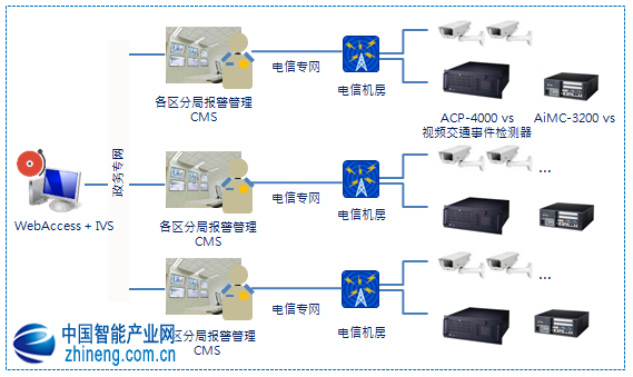 系統(tǒng)前端采用的NVR已內(nèi)置研華WebAccess+IVS智能影像分析軟件,可同時(shí)從IP攝像機(jī)和模擬攝像機(jī)采集視頻數(shù)據(jù)。通過研華 WebAccess+IVS,用戶可便捷使用智能視頻分析功能,如禁區(qū)檢測(cè)、物體追蹤以及客流統(tǒng)計(jì)。每個(gè)警局都需一個(gè)CMS系統(tǒng),用于收集每個(gè)十字路口的 NVR數(shù)據(jù)。這些CMS系統(tǒng)可訪問已連接的所有NVR/DVR設(shè)備,并可遠(yuǎn)程控制攝像機(jī)以查看任何道路或十字路口的實(shí)時(shí)影像。