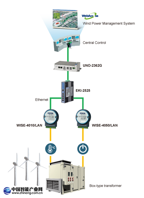 通過嵌入式無風扇工業(yè)電腦UNO-2362G、非網(wǎng)管型工業(yè)以太網(wǎng)交換機EKI-2525以及兩款物聯(lián)網(wǎng)以太網(wǎng)I/O模塊WISE-4010/LAN與WISE-4050/LAN,研華解決方案即能將現(xiàn)場各種裝置的信號與數(shù)據(jù)上傳至中心監(jiān)控室內(nèi)的風場監(jiān)控系統(tǒng)。其中,可支持Windows CE、Windows XPE、Embedded Linux等多種開放式操作系統(tǒng)的UNO-2362G能以更好的兼容性來取代原有的RTU;而提供高速以太網(wǎng)絡(luò)傳輸?shù)腅KI-2525所形成的局域網(wǎng)絡(luò)(LAN)則負責串連現(xiàn)場所有的硬件裝置,并藉此讓風力發(fā)電機成為可被監(jiān)控的聯(lián)網(wǎng)設(shè)備。